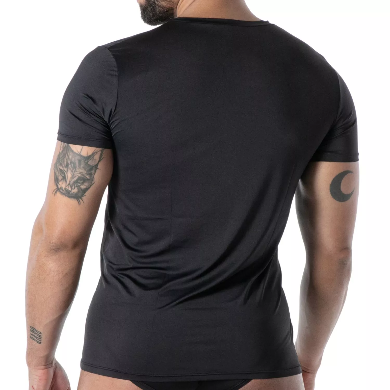 A black microfiber t-shirt with a modern, fitted cut, made in France. Combining softness, comfort, and style for a sexy, elegant, and bold look.