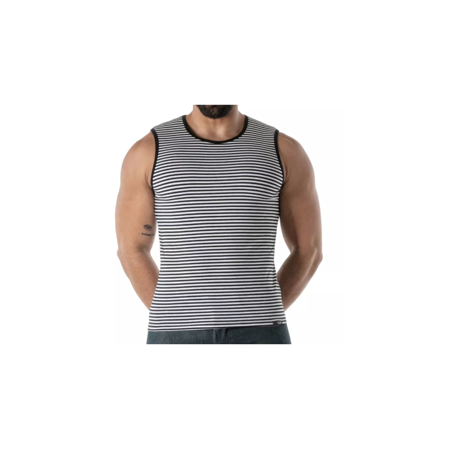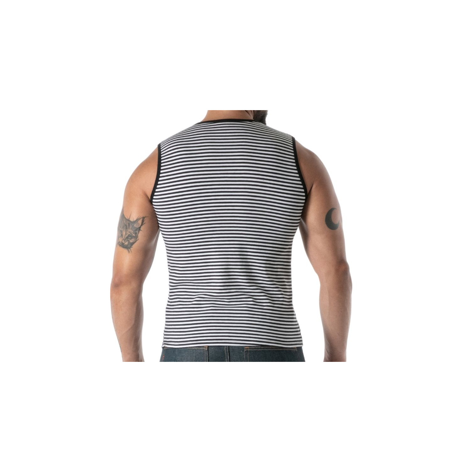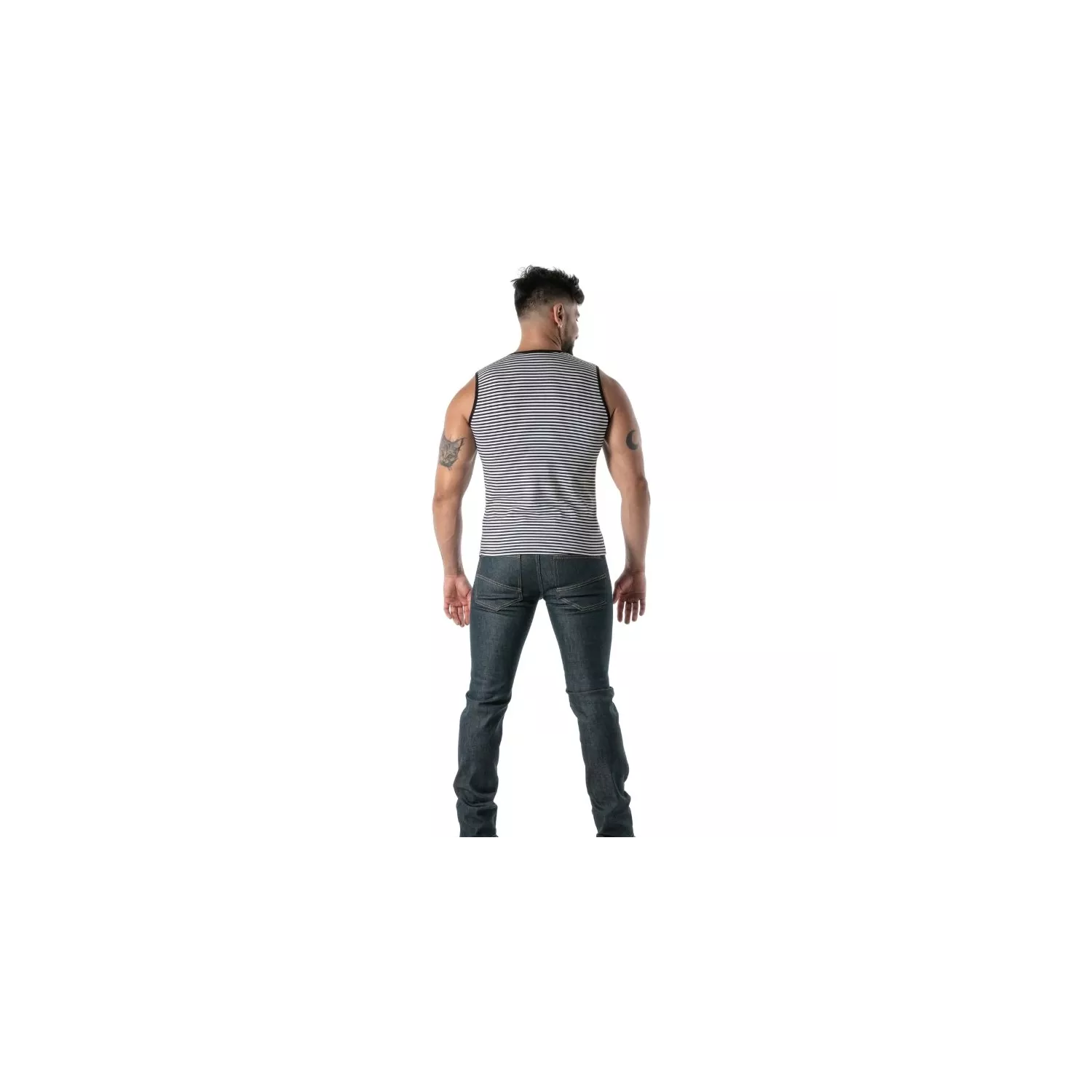“this black stripe tank top is a statement of confidence and style. The quality of the fabric, the precise cut, and the refined detail of the logo make it a versatile piece that elevates any outfit. It’s ideal for men who want to explore their sensuality while maintaining a sophisticated edge. A true icon of modern masculinity.”