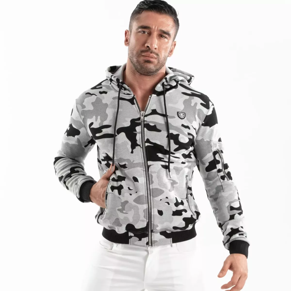 "The TOF Paris men's hoodie strikes the perfect balance between style and comfort. The camouflage pattern, premium finishes, and warm fleece fabric make it a must-have for mid-season. Pair it with the Temptation Microfiber White Boxer or the Temptation Microfiber Red Bikini for a bold, sexy look."
