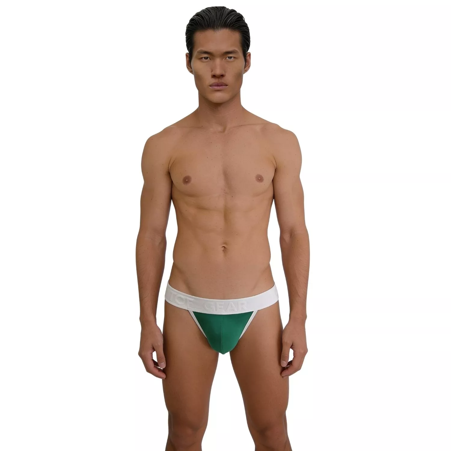 “The jockstrap mood green is a statement piece that never sacrifices comfort. The Made in France construction gives a refined, durable finish you feel from the first touch. The contrast bands and lights-on pink hue make the silhouette unmistakable perfect for expressing self-expression with confidence.”