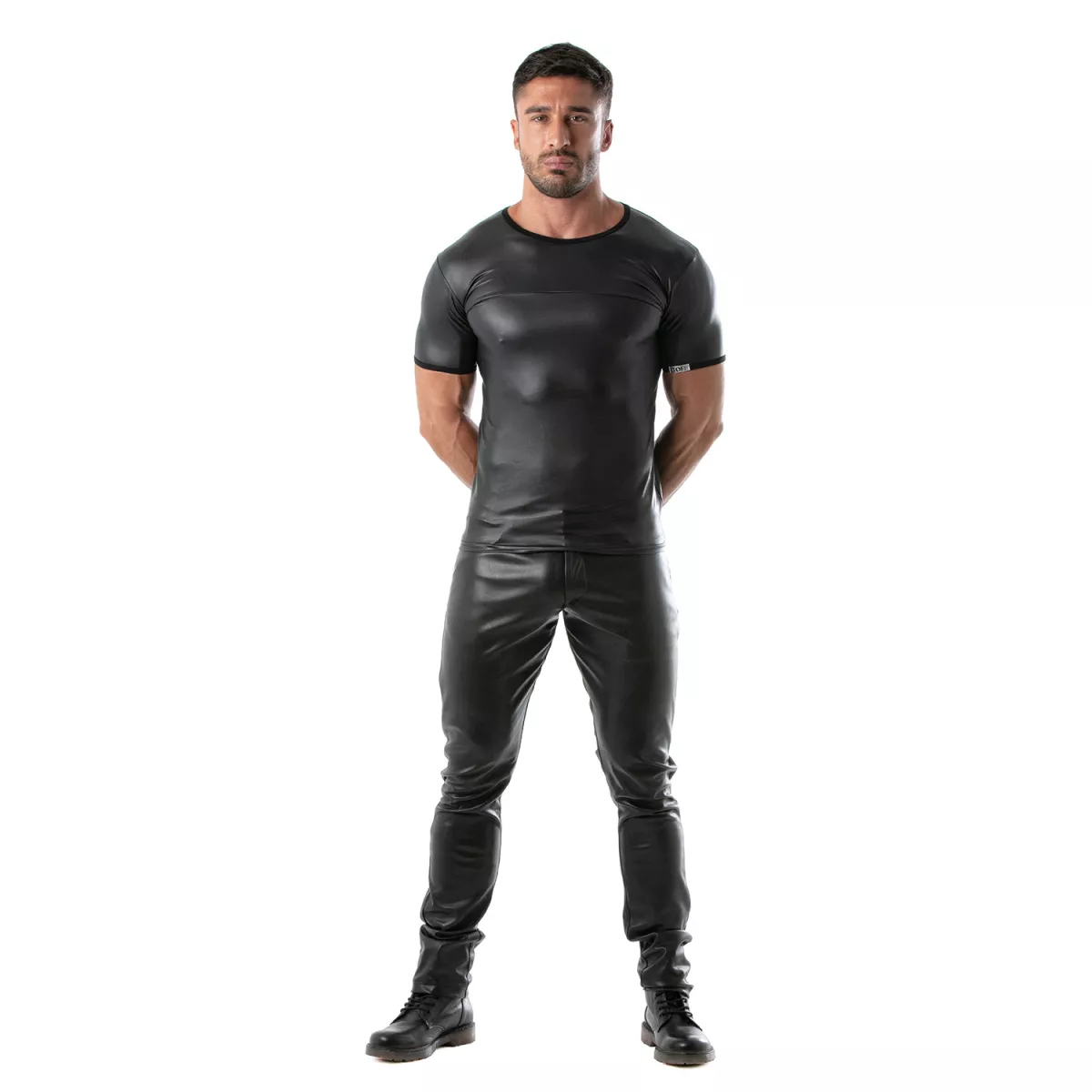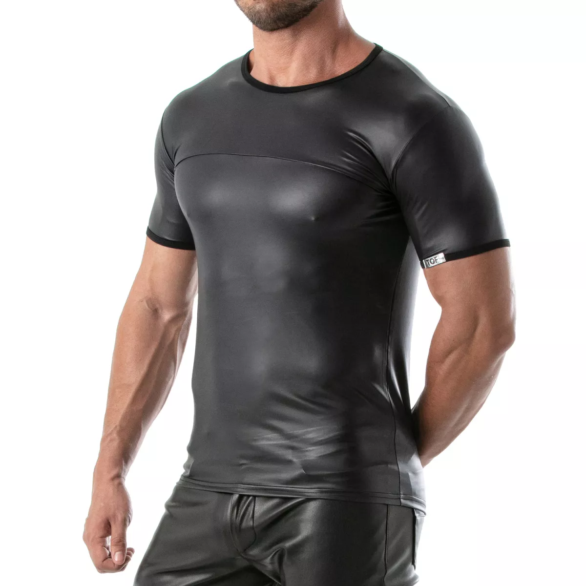 Experience the pinnacle of bold men's fashion with our TOF Paris stretch faux leather fetish t-shirt. Tailored for the bold, this form-fitting shirt is a cornerstone of any contemporary wardrobe. Marrying sophistication with an edge, it perfectly captures the essence of gay fashion and masculine clubwear.