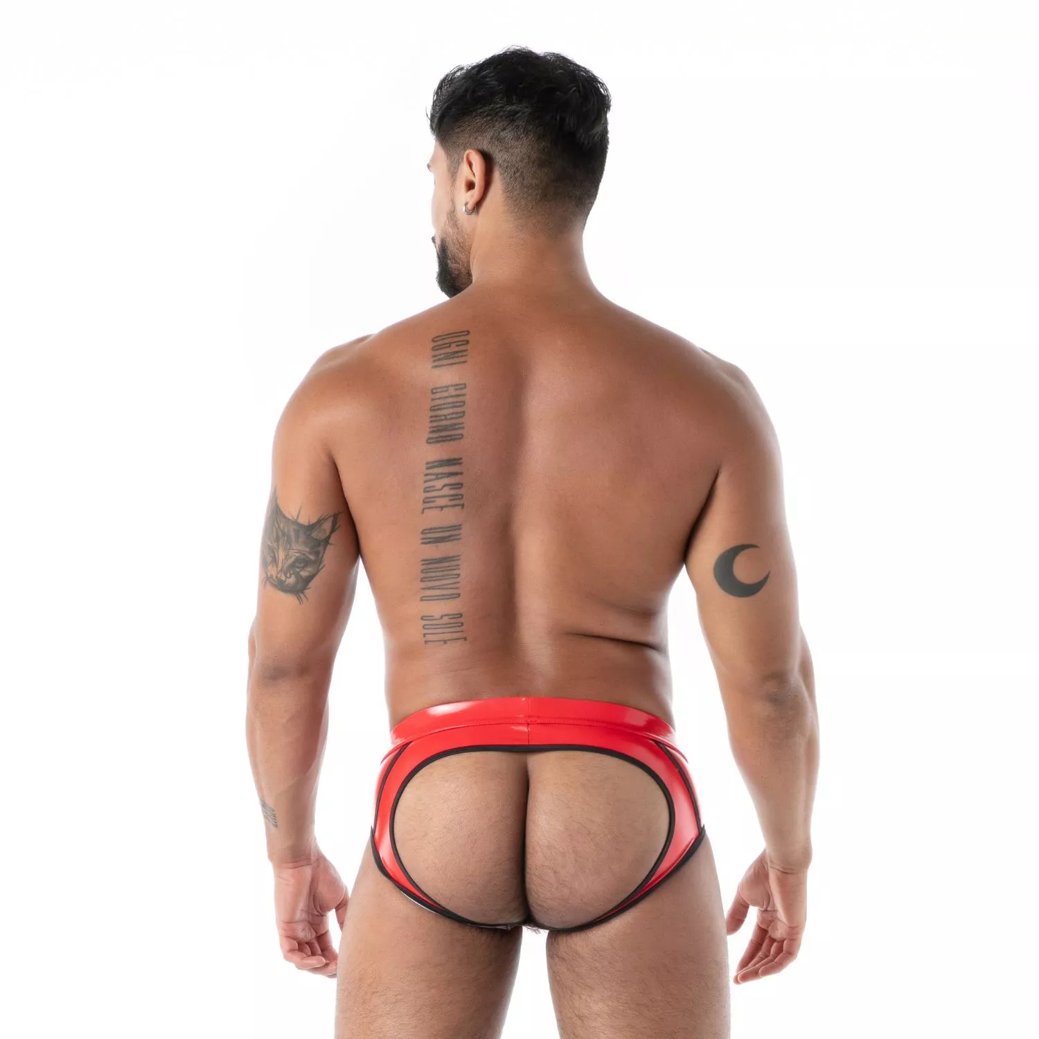 The open slip in red latex second skin is made from 100% caoutchouc, a material celebrated for its flexibility, shine, and sensual texture. The inclusion of a jersey lining enhances comfort, making it suitable for extended wear. The design features a low-rise cut that accentuates the hips and a backless structure that invites touch and admiration.