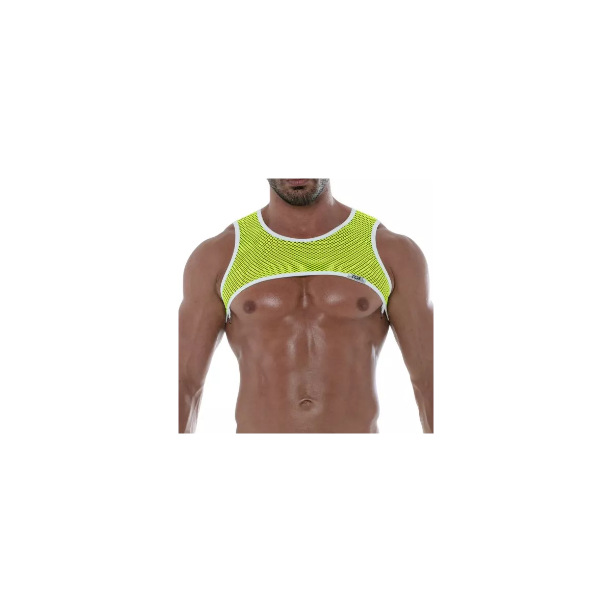 Elevate your style with TOF Paris' Neon Mesh Harness Yellow, a fluorescent mesh piece spotlighting your chest, complete with contrast straps and a chic TOF logo.