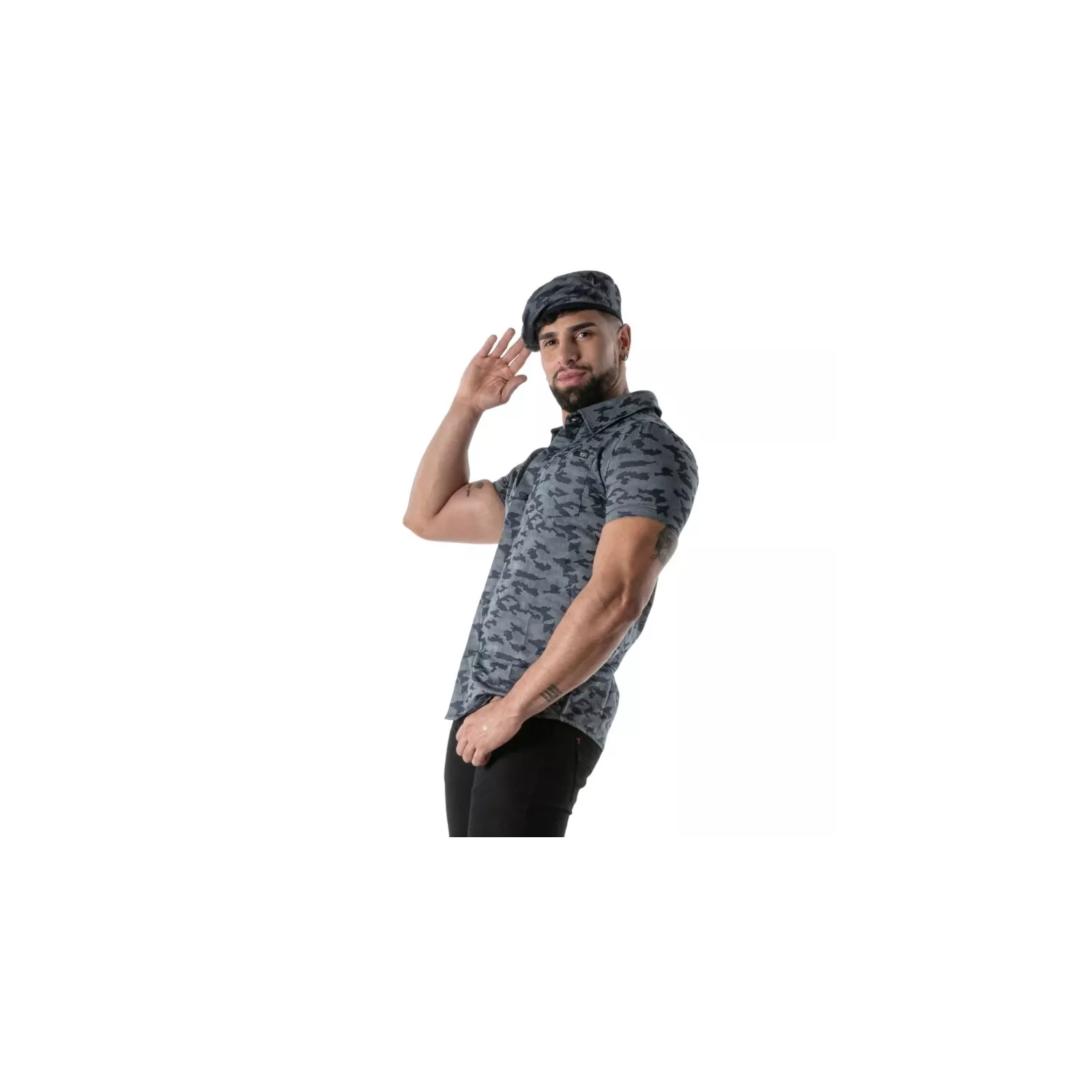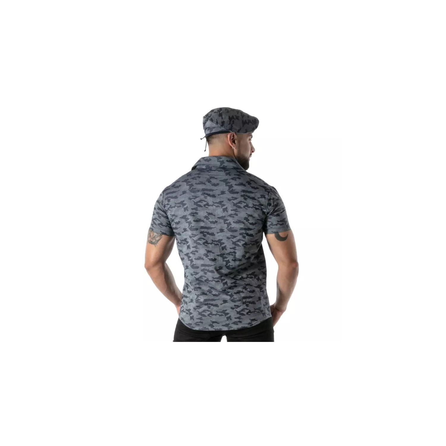 make a statement with the camo beret, a signature piece crafted for those who want to express confidence and attitude with effortless style. designed and sewn in paris, this double-faced headwear in lightweight denim and light gray gabardine offers a versatile accessory that elevates any casual or fetish look. its unique camouflage print in raw denim creates a subtle yet bold statement, perfect for men who refuse to blend in. whether you want to add a rebellious touch to your streetwear or showcase a refined edge at the club, this beret is your ultimate weapon for self-expression.