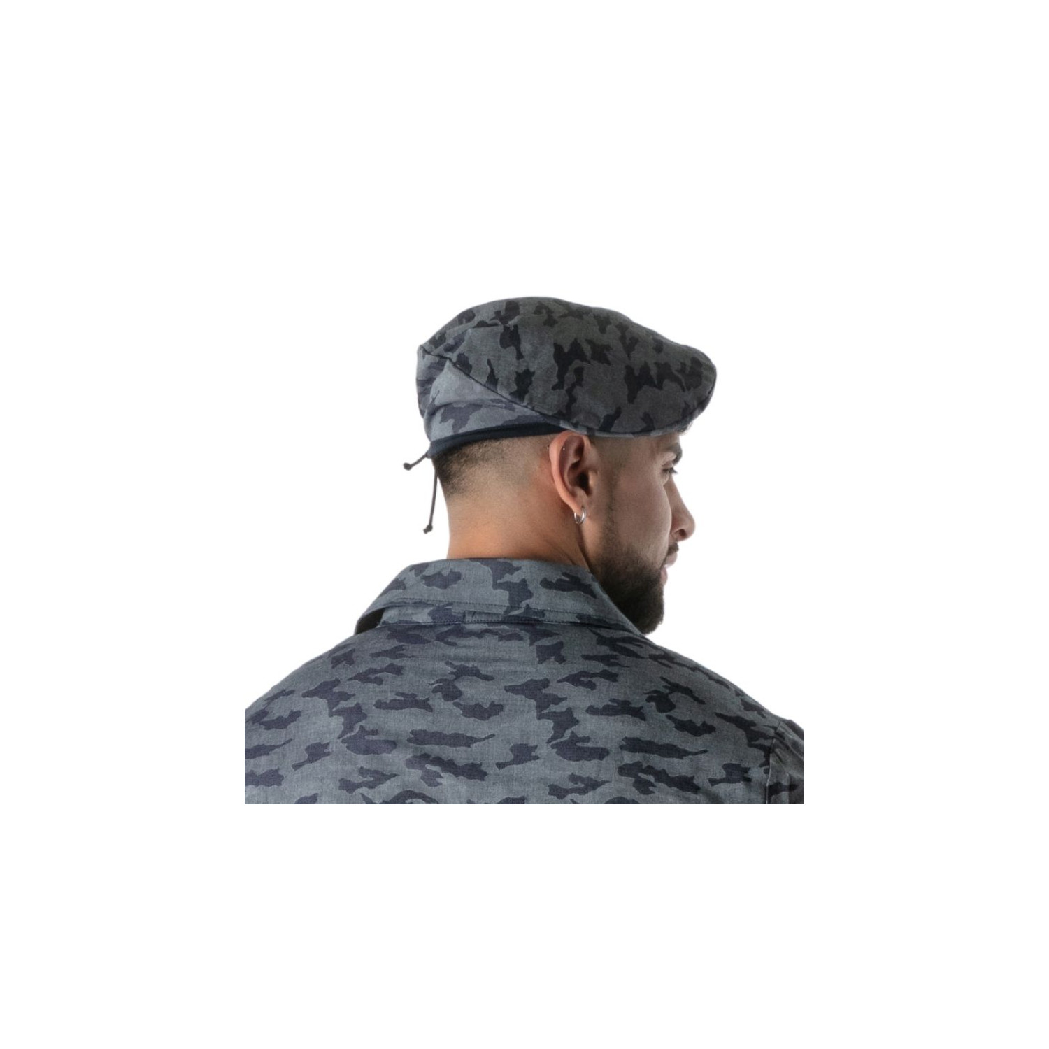 constructed from a blend of 27% polyester and 3% elastane, the camo beret offers exceptional comfort and resilience. its lightweight denim exterior paired with light gray gabardine ensures a tactile experience that is both soft and durable. designed as a one size fit, it adapts effortlessly to most head sizes thanks to the adjustable drawstring, providing a snug yet comfortable fit. The Parisian craftsmanship elevates this accessory to a level of sophistication that resonates with men who seek a stylish yet practical piece to enhance their wardrobe.