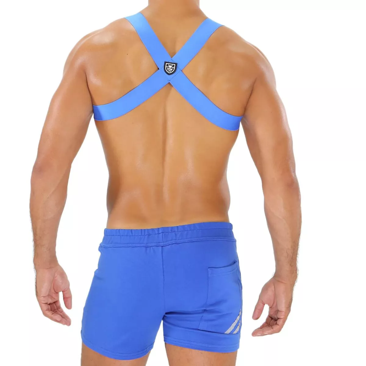 Blue party boy elastic harness: Accentuate your chest with this 1.2-inch elastic harness, featuring a zamac buckle for added flair. Ideal for home or club wear. Sizes XS to XXL. Machine washable.