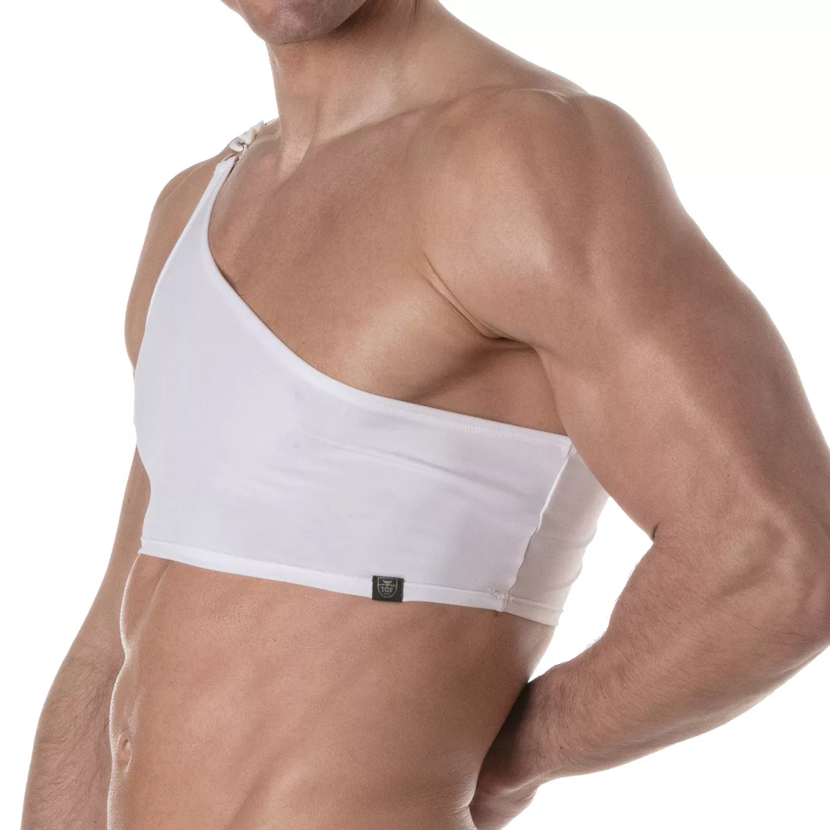 Explore the Chain Top White: a unique, asymmetrical half tank top with a chain strap. Snug polyamide fit, adorned with TOF emblem. Parisian design and tailoring. Machine washable at 30°C.