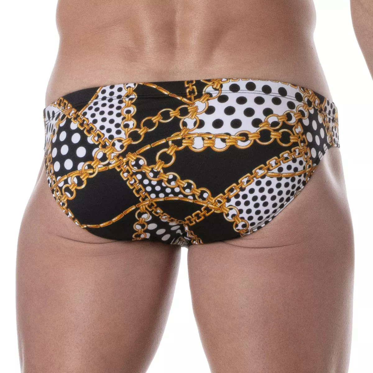 Discover our men's swimwear, a minimalist undergarment that combines comfort and style, perfect for beach fashion. This swimwear with its baroque floral design is a true masterpiece from our Parisian sewing workshop, embodying contemporary elegance and textile innovation. With its baroque patterns, chain and polka dots, this sunga style is a luxury ready-to-wear item, exclusive to our boutique.