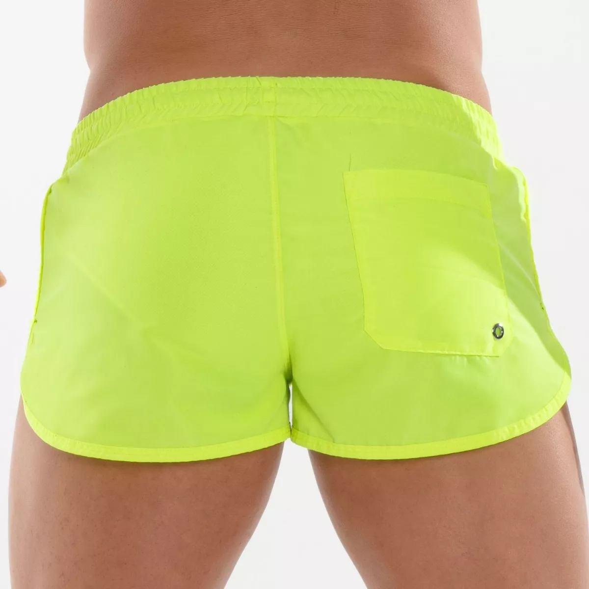 "This mini swim short is a true star of neon parties! Its UV-reactive fabric makes it unique, and its cut is perfect for a sexy, confident look."