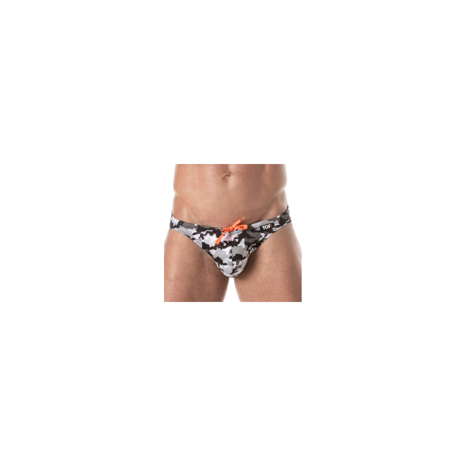 Make a bold statement with the Iconic swim bikini. The bikini Iconic is a minimalist swim brief that stands out effortlessly. Featuring nautical stripe or camouflage patterns, it combines trendy design with masculine elegance. Its low-rise fit and ultra-slim cut beautifully enhance your physique, while the thin waistband with a TOF-branded drawstring ensures a secure and impeccable fit in every situation.