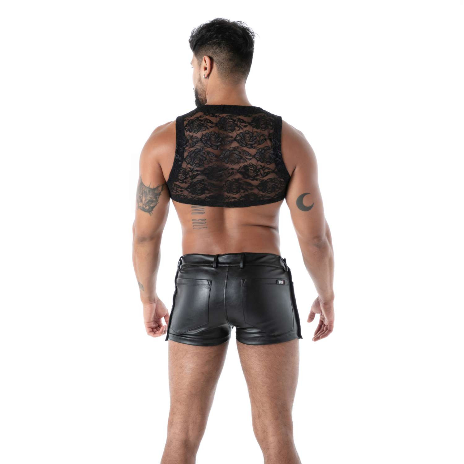 Step into TOF Paris’s sensual universe with this sexy zip-up crop top in flowing black lace, designed for all styles and all desires. To complete your look, pair it with sexy men’s leggings, a sexy t-shirt or tank top, or a sexy men’s pant. Want something see-through? Check out our transparent men’s leggings, our long-sleeve lace shirt, or the mesh kimono pants.