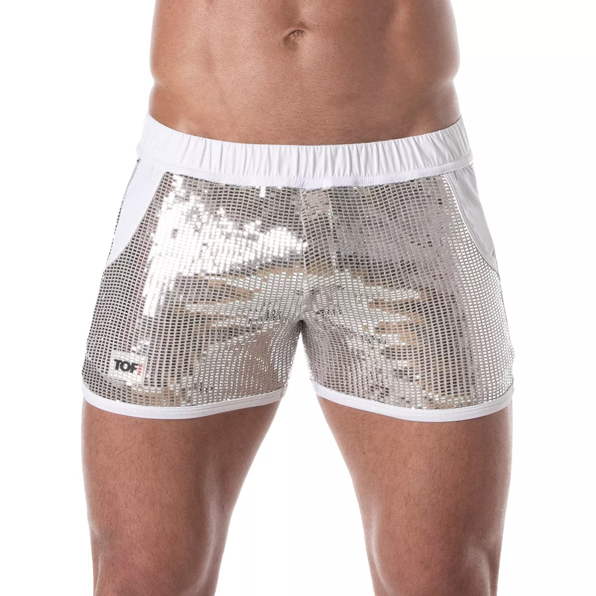 Shine bright at your parties with the sexy glitter shorts by TOF Paris. Designed for bold men, these men's short shorts, mid-thigh length and adorned with sparkling sequins, offer a unique and glamorous style for festive or themed events.
