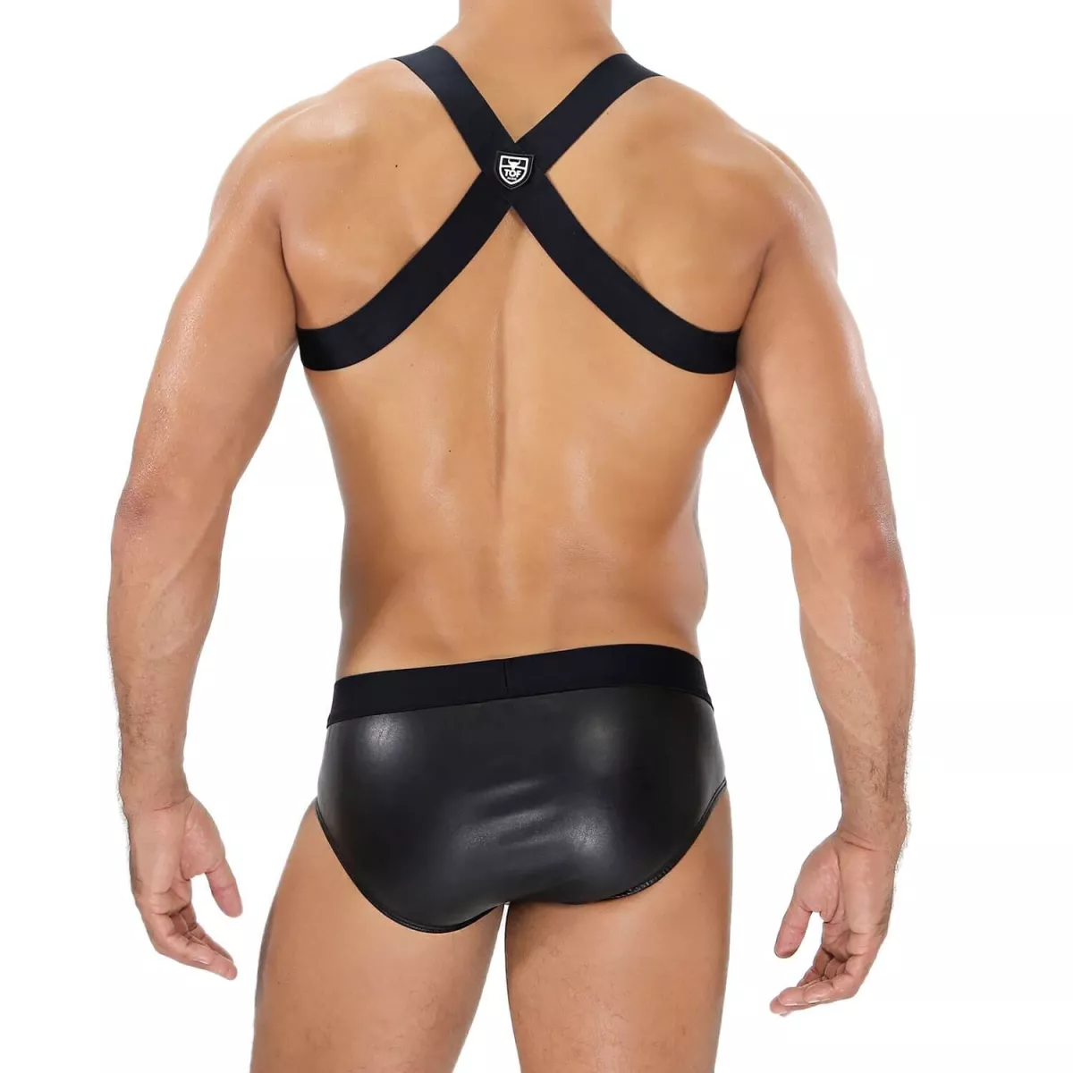 Fabriqué avec une sangle élastique de première qualité, le harnais élastique party boy noir épouse votre corps tout en préservant une liberté de mouvement totale. La coupe est étudiée pour valoriser la silhouette masculine, avec des sangles croisées dans le dos qui dessinent un look résolument provocateur.