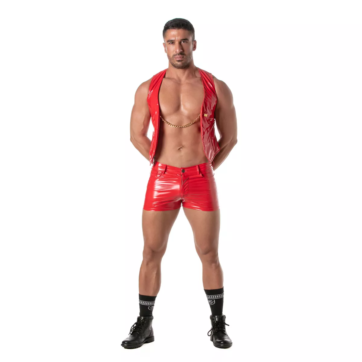 Fabriqué à partir d’un vinyle haut de gamme, ce gilet offre un tombé parfait, épousant les courbes sans jamais entraver vos mouvements. La chaîne métallique est soigneusement intégrée pour un maintien optimal et une allure captivante. Que vous optiez pour la version rouge ou noire, chaque détail a été pensé pour refléter votre personnalité et votre audace.