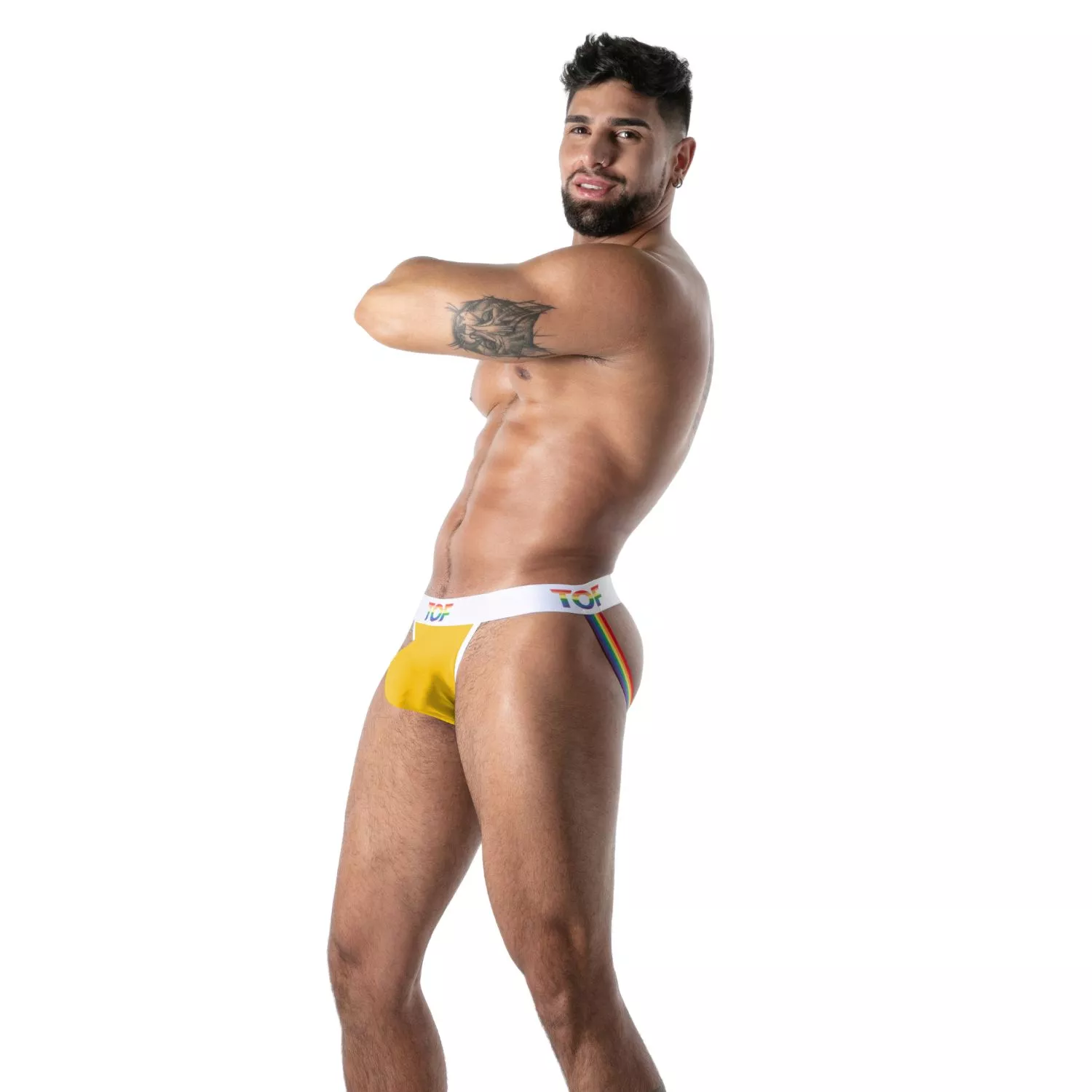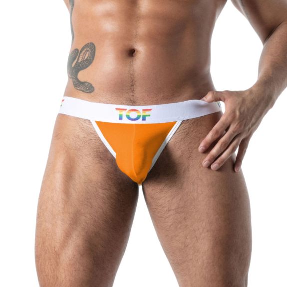 Créé pour les amateurs de jockstrap homme, le pride joyful offre un rendu visuel irrésistible grâce à sa conception ergonomique et à sa bande élastique rainbow, spécialement étudiée pour remonter les fesses et mettre en valeur la courbure naturelle du corps. La ceinture arc-en-ciel, rehaussée du logo TOF imprimé, apporte une signature forte, symbolisant la liberté, la fierté et un style résolument assumé.
