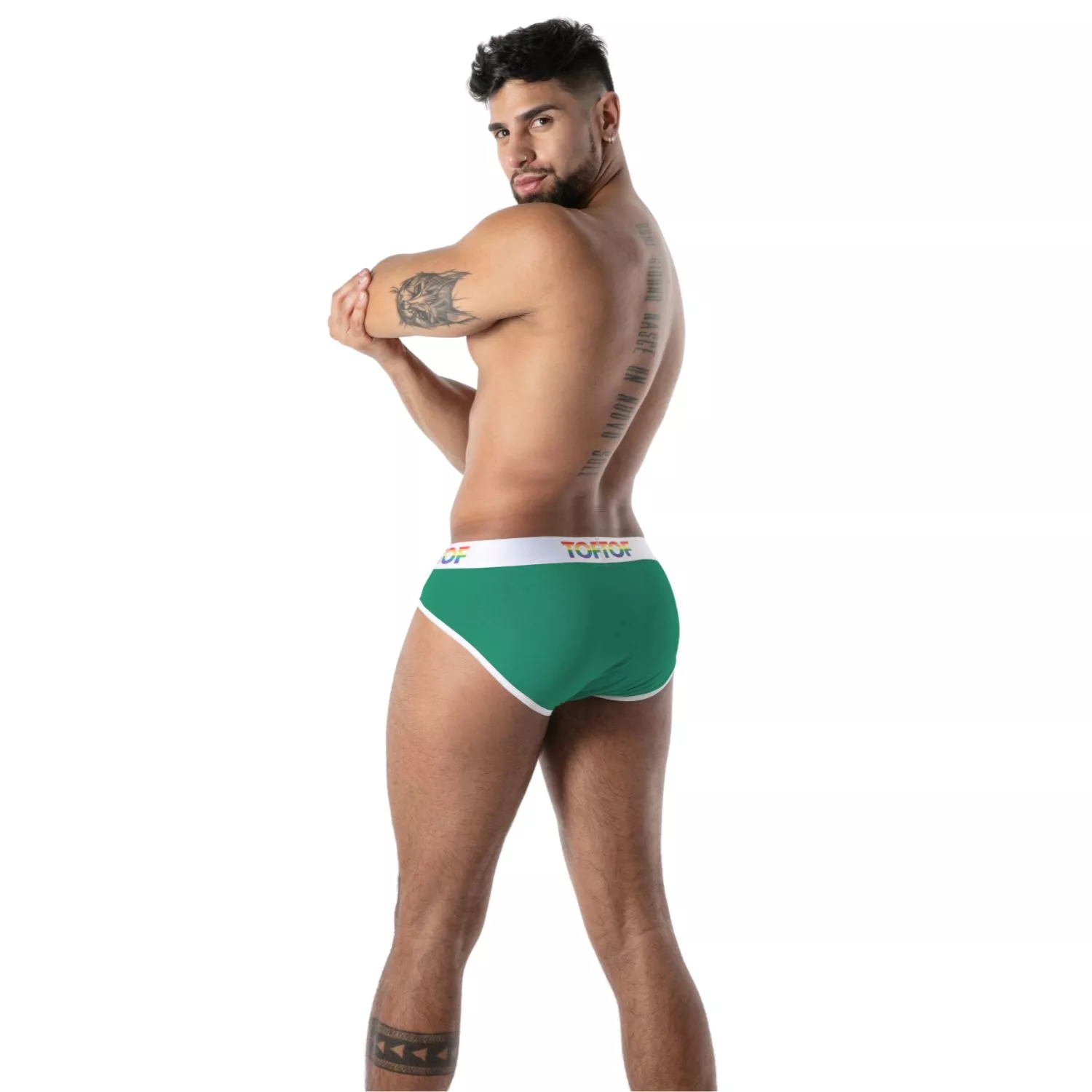 Sur le côté, la bande rainbow offre une signature visuelle forte, symbole de fierté et d’ouverture, tandis que la ceinture élastique ornée du logo TOF vient compléter ce mélange réussi entre style audacieux, confort et allure contemporaine.