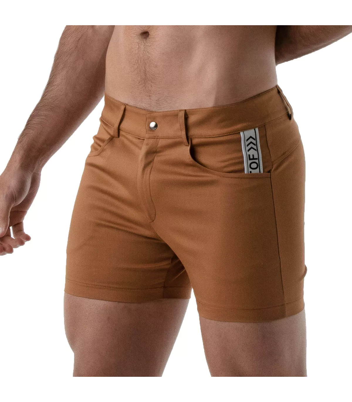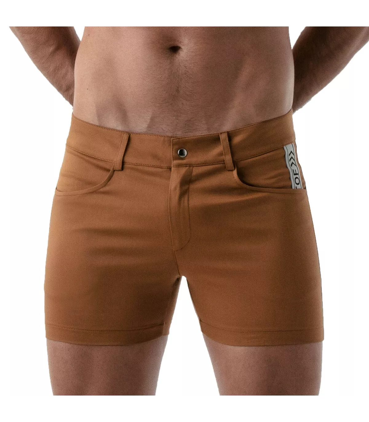 Bermuda camel sexy taille basse et confortable cousu dans un tissu stretch légèrement satiné