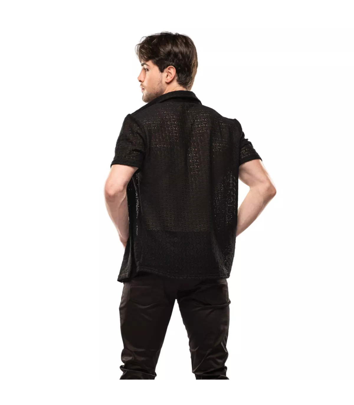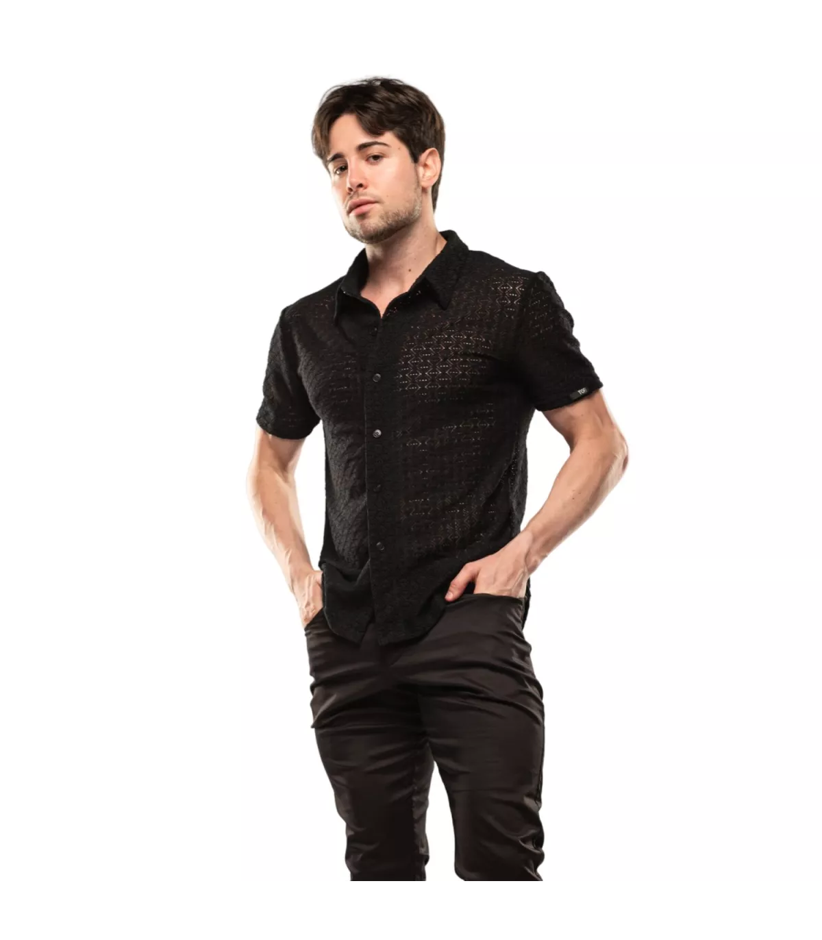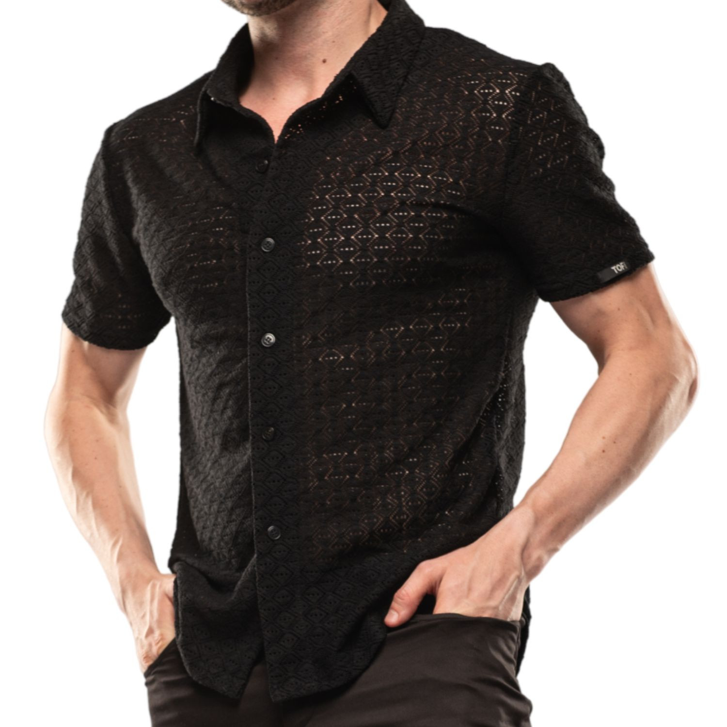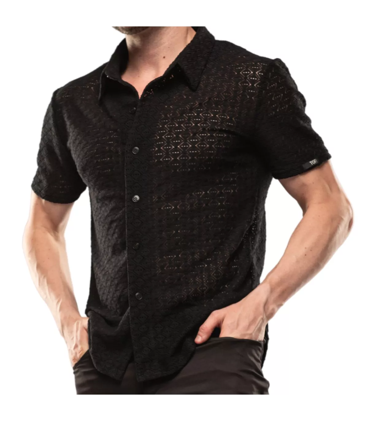 Chemise à manches courtes-tissu dentelle stretch- Coupe ajustée- logo TOF Paris tissé discret- Fabrication française.