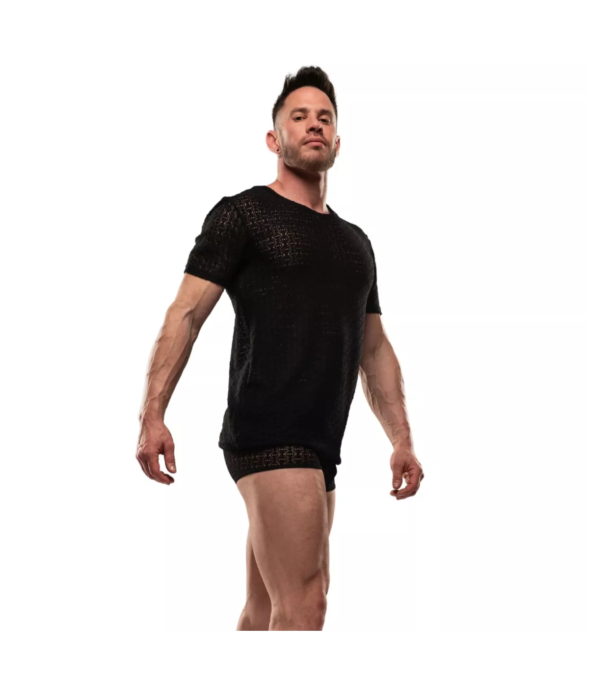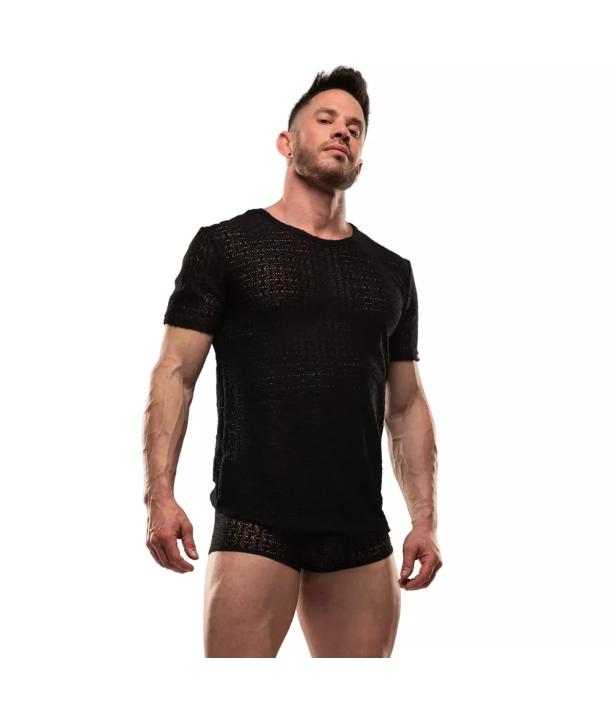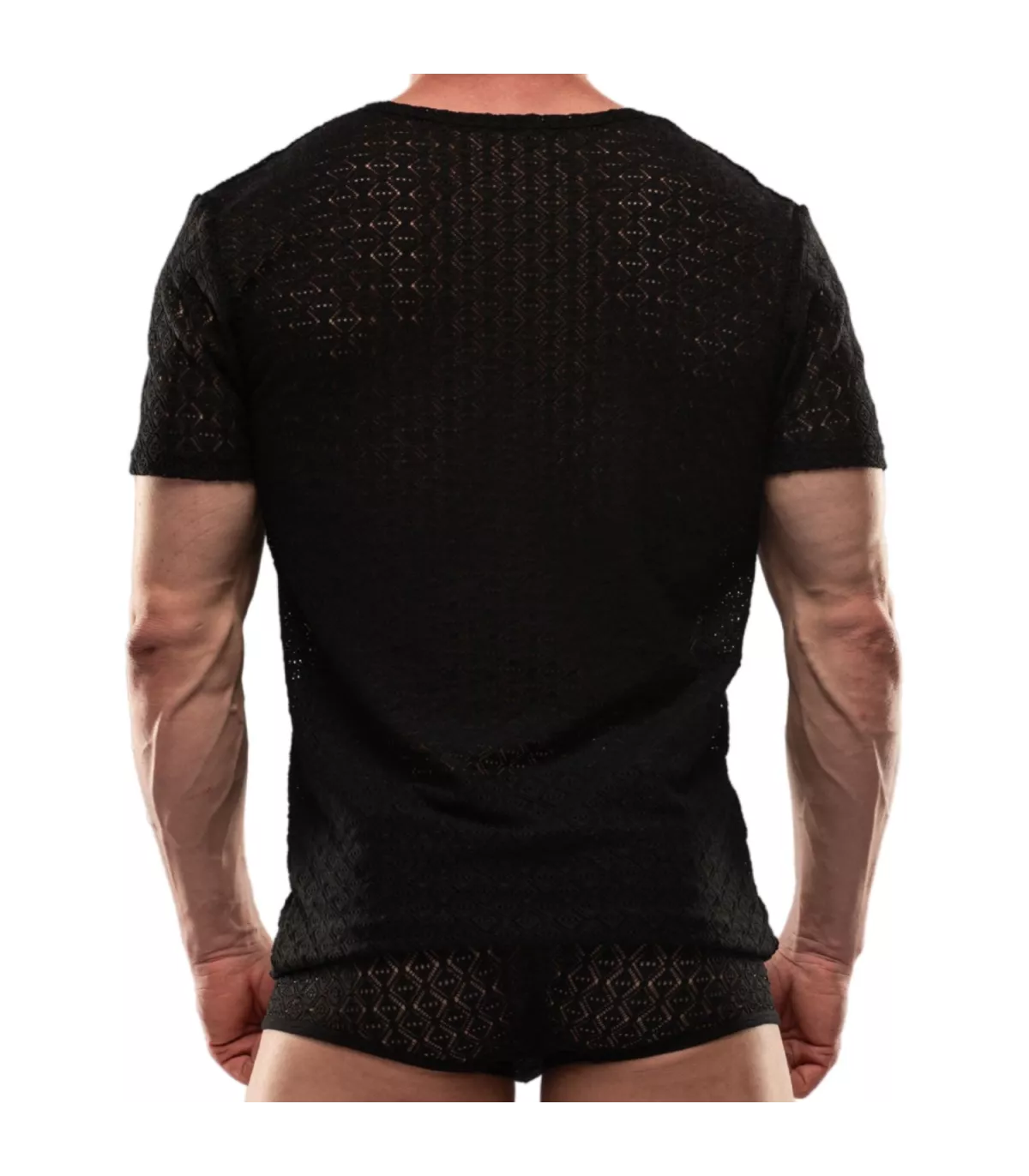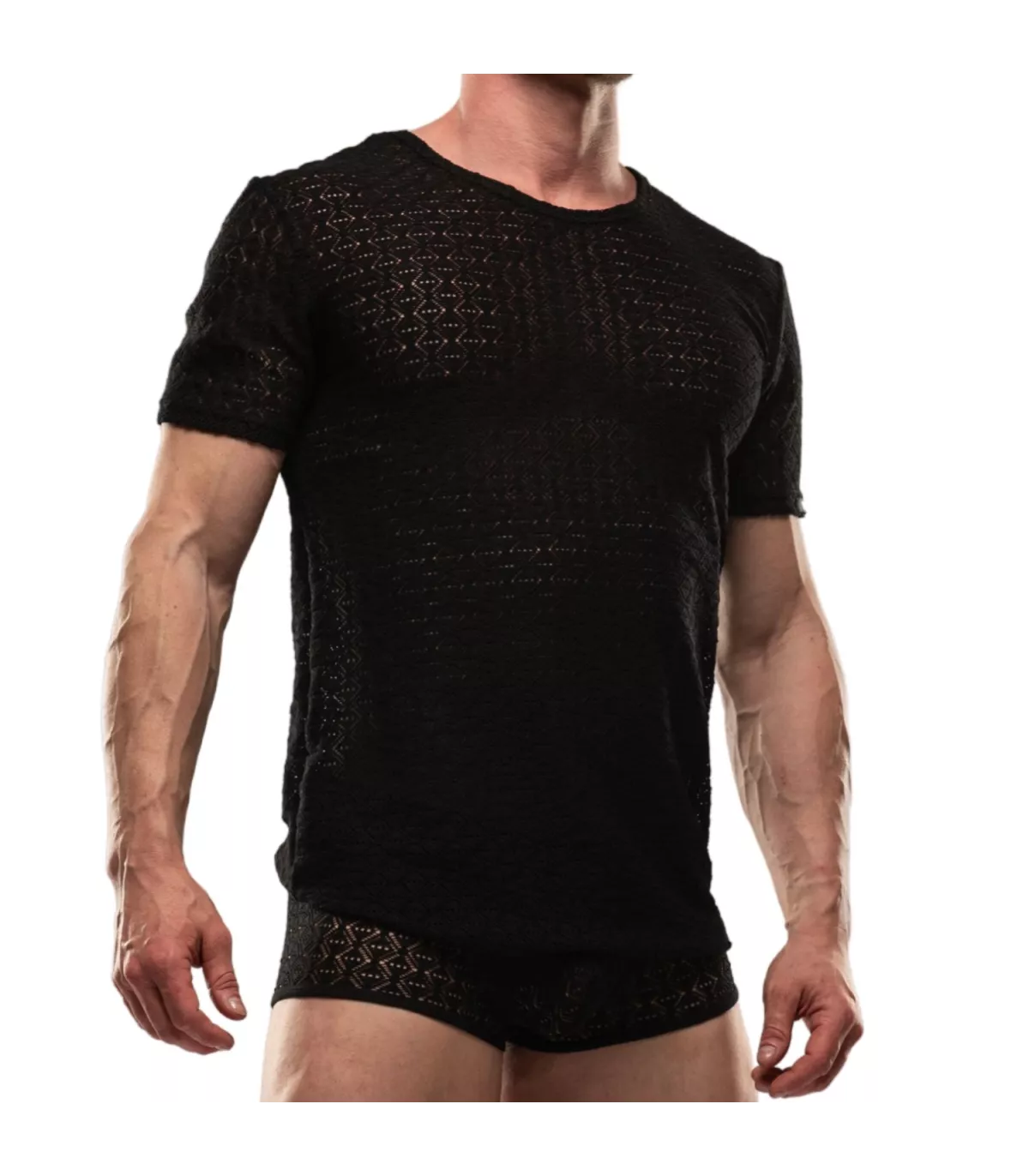 T-shirt d'été à col rond et manches courtes-Tissu ajouré dentelle stretch-Logo TOF Paris cousu manche gauche.